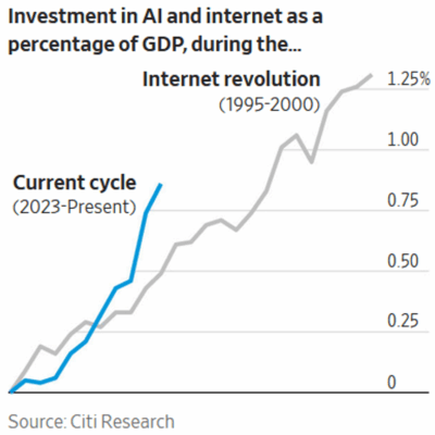 For det første er investeringane i AI store, og større enn på same tidspunkt under dot-com, målt som andel av BNP. Samtidig: mesteparten av investeringane er framleis planlagde, og totalt sett vart det investert meir under dot-com, som andel av BNP, enn hittil under AI-bølgja. Ein bekymring er riktignok at datachippane ikkje har veldig lang levetid. I kjølvatnet av dot-com var det finansiert og bygd ut mykje fibernett som har blitt brukt i tiåra etterpå.