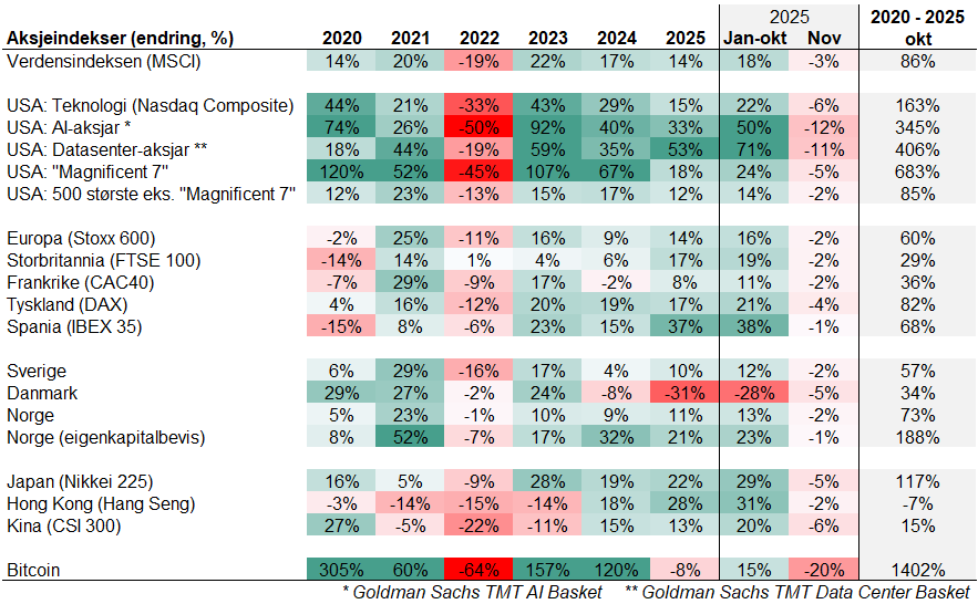 I november har derimot marknaden vore negativ. Trass i generelt gode Q3-resultat har aksjar falt, og særleg merksemd fekk Meta sine Q3-tal. Selskapet leverte eit (justert) resultat per aksje 17% over analytiker-forventning, men falt likevel nesten 11% på børs. Fallet vart begrunna med at dei kommuniserte fortsatte store investeringar i kunstig intelligens. Aksjen er no ned 25% sidan før resultatslippet, og nesten på nullavkastning for året.